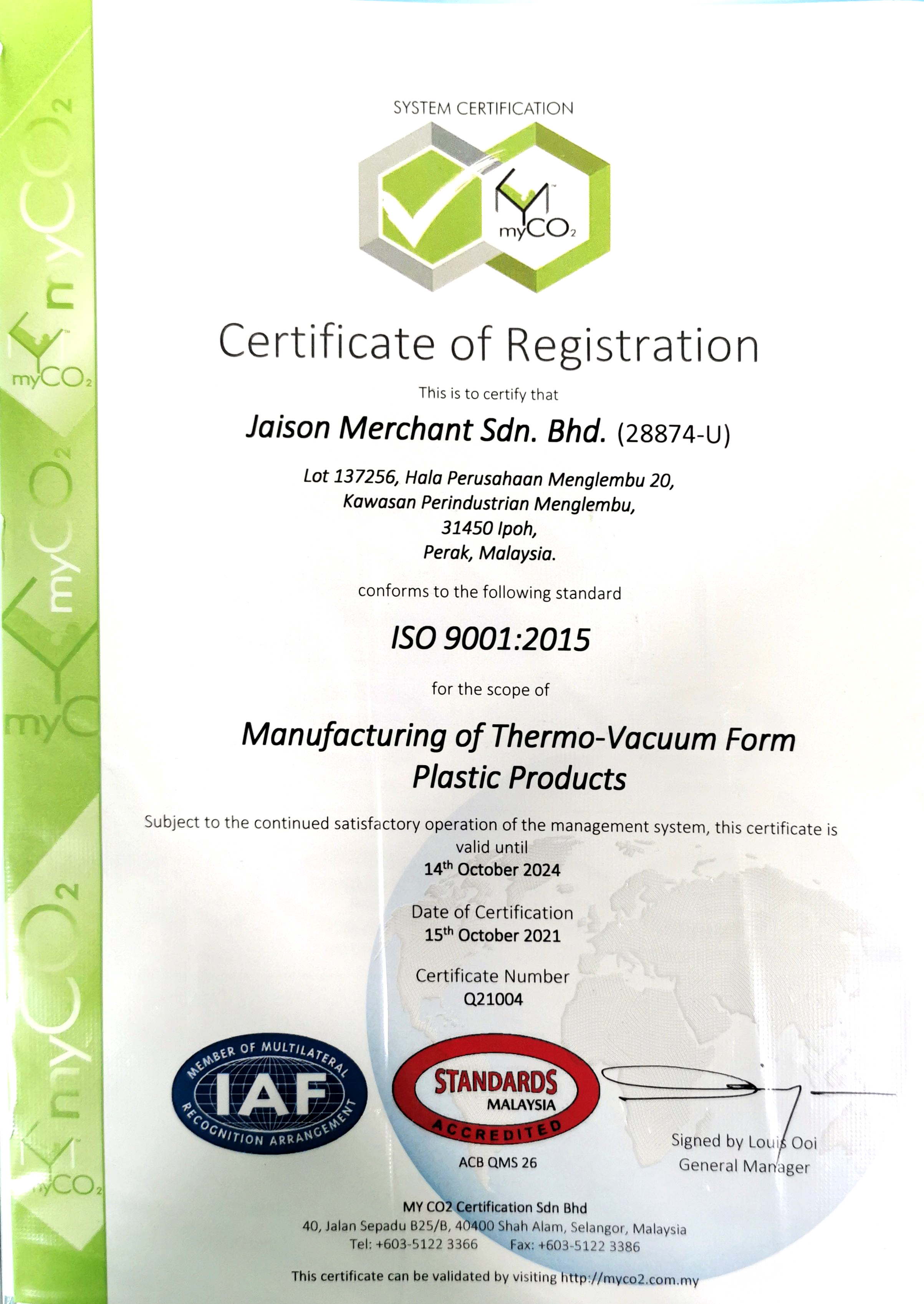 Jaison Merchant Sdn Bhd is a humble manufacturer of thermoforming in Perak with environmental responsible production lines. Established since 1995, the company possesses years of experience and continues to improve its product ranges. We are officially certified with ISO 9001:2015 QUALITY MANGEMENT SYSTEM.